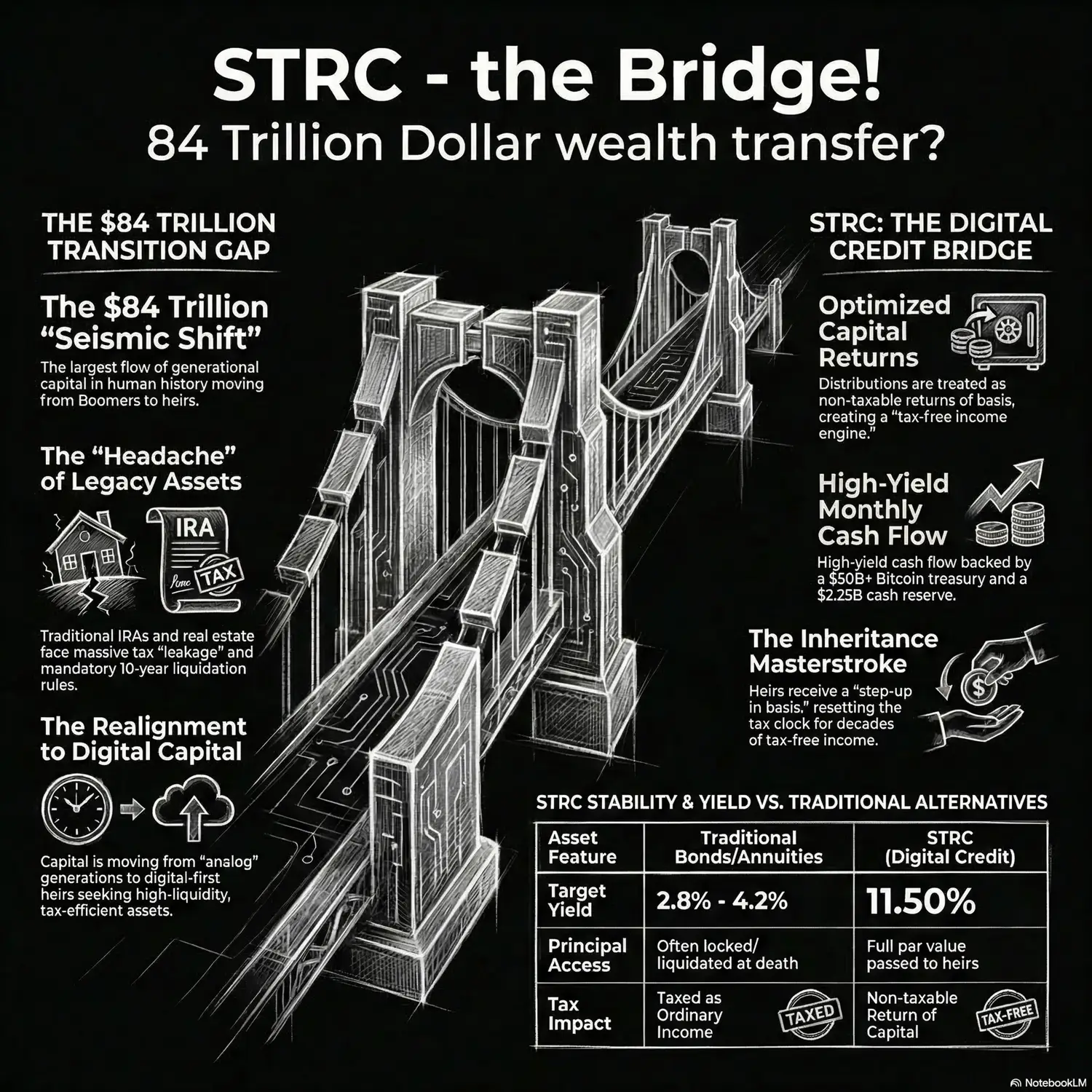 Research Mosaic STRC CourseThe Generational Wealth Transfer#GreatWealthTransfer: Refers to the massive demographic shift where an estimated $83 trillion to $84 trillion will be passed down from the Silent Generation and Baby Boomers to their heirs over the next twenty years.#SeismicShift: A term used by experts to describe the wealth transfer as a foundational movement that will reshape the entire financial landscape.#GenerationalWealth: Highlights the focus on not just accumulating assets, but efficiently preserving and transitioning wealth across generations.#FundamentalRealignment: Describes the permanent structural transformation in global economic power and investment priorities as capital moves from "analog" to "digital" generations.#WealthPreservation: The strategic goal of protecting capital from taxation, inflation, and market volatility so it can be efficiently passed to heirs.#OpportunityTransfer: A rebranding of the wealth transfer event to emphasize that it is a massive transfer of opportunity and responsibility, rather than just a movement of money.Financial Instruments & Strategy Inc.#STRC: The ticker symbol for Strategy Inc.’s Variable Rate Series A Perpetual Stretch Preferred Stock, a high-yield digital credit instrument designed for income and wealth transfer.#StrategyInc: The enterprise software firm and the world’s first and largest Bitcoin Treasury Company, which issues STRC to bridge legacy fiat capital with digital assets.#DigitalCredit: A new category of security that offers a credit-like, high-yield experience backed by digital assets, shielding investors from principal risk while benefiting from Bitcoin's volatility premium.#ReturnOfCapital (or #ROC): Corporate distributions that are not sourced from earnings and profits, making them a non-taxable return of the investor's original basis rather than taxable dividend income.Tax & Retirement Optimization#TaxFreeInheritance: The strategy of using ROC instruments to pass down a tax-free income stream to heirs, avoiding the heavy tax burdens typically associated with inheriting assets.#StepUpInBasis: A tax rule where inherited securities have their tax basis reset to the fair market value upon the benefactor's death, allowing the tax-free ROC distribution cycle to begin anew for the heirs.#IRAOptimization: Strategies to maximize Individual Retirement Accounts, such as using STRC's 11.50% yield to solve income deficiencies and protect against sequence of returns risk.#TaxDeferredIncome: The cash flow generated by ROC distributions for living investors, which delays taxation until the asset's basis reaches zero or the asset is sold.#RetirementPlanning: The process of securing a high-yield, volatility-free income for a peaceful retirement while systematically preparing those assets for a hassle-free transfer to children.Bitcoin & Digital Capital#BitcoinTreasury: A corporate model where a company adopts Bitcoin as its primary reserve asset, using capital markets to aggressively accumulate the digital currency.#DigitalCapital: A modern asset class, including digital assets like Bitcoin, that is rapidly gaining legitimacy and institutionalization in the financial ecosystem.#DigitalFortress: Strategy Inc.’s secure financial architecture, featuring a $2.25 billion USD reserve and massive Bitcoin holdings, designed to guarantee uninterrupted dividend payments even during a crypto bear market.#BitcoinStrategy: The corporate approach of "accretive accumulation" of Bitcoin, which strengthens the company's balance sheet, secures dividends, and drives a reflexive loop of value creation.