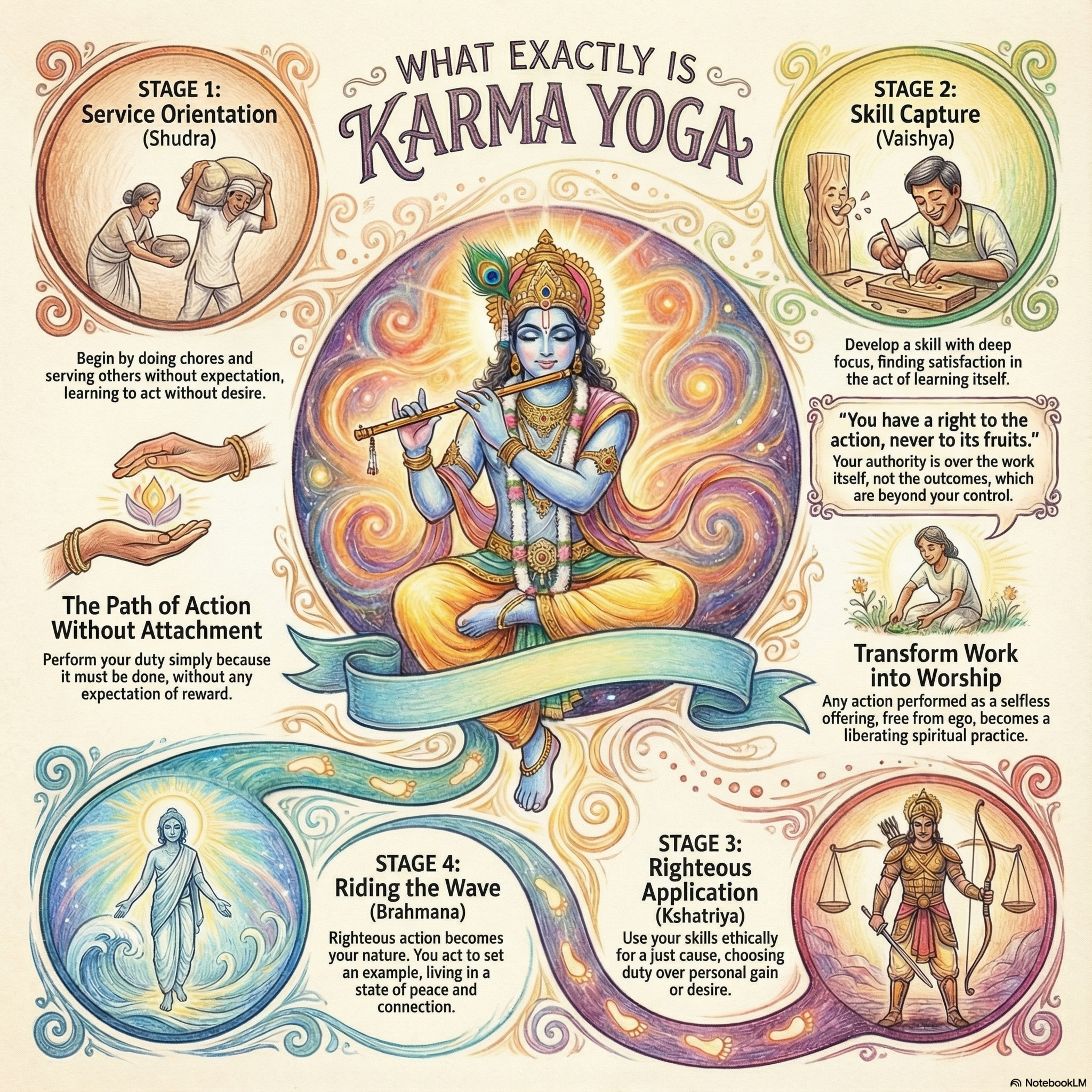 Research This episode explores the philosophical underpinnings of Karm Yoga through the legendary dialogue between Krishna and Arjuna on the battlefield of the Mahabharata. It frames the Gita not just as a religious scripture, but as a practical ritual of actions designed to help individuals move beyond the paralysis of desire and duality. The author outlines a developmental roadmap consisting of four stages—service, skill building, righteous application, and realization—to guide seekers from menial chores to the embodiment of universal truth. By advocating for a total separation of actions from outcomes, the narrative teaches that focusing on the "how" of a task rather than its "fruit" leads to mastery of the self and eternal peace. Ultimately, the source presents Karm Yoga as a transformative skill that empowers people to fulfill their worldly duties while accessing the deep, hidden knowledge within their own souls.#KarmaYoga – The overarching discipline of achieving union through action.#KaryamKarma – Specifically refers to "obligatory duty" or actions that "must be done."#NishkamaKarma – The methodology of acting without desire for results or "fruits."#BhagavadGita – The primary source text for these teachings.#GitaWisdom – General search term for insights from the scripture.#NonAttachment – The internal state of being Asakta while performing duty.#Duty – Centering the conversation on obligation over personal inclination.These hashtags highlight the developmental framework described in the sources.#ServiceOrientation – The first stage (Shoodra), focusing on selfless physical tasks to break desire-driven habits.#SkillBuilding – The second stage (Vaishya), focusing on "Skill Capture" or Yajna.#RighteousAction – The third stage (Kshtriya), applying skills ethically amidst conflict.#SpiritualEvolution – The progression toward becoming a Bramhana or "Riding the Wave."#SelflessService – Performing chores and errands as a way to find internal peace.#ProfessionalEthics – Applying the "Righteous Application of Skills" to modern fields like medicine, law, and AI.#ActionVsOutcome – The central psychological shift from chasing "jackpots" to focusing on the process.#OvercomingProcrastination – Using service-oriented tasks to gain freedom from desire-led motivation.#Equanimity – Maintaining balance during success and failure.#InnerPeace – The byproduct of relinquishing outcome obsession.#MindfulnessInAction – Bringing full attention and excellence to the present task.#SelfRealization – Using action as a mirror to see into the "black box" of the self.#Vedanta – The broader philosophical system encompassing these teachings.#AdiShankaracharya – For the Advaita view of duty as a means for Chitta Shuddhi (mind purification).#Ramanujacharya – For the Vishishtadvaita view of duty as divine service.#Madhvacharya – For the Dvaita focus on grace and devotion through duty.#LokaSamgraha – The concept of acting for the "maintenance of the world" and social order.#Akarma – Achieving the state of "non-action" or transcendental activity that does not bind.#LordKrishna – The supreme teacher and strategist of the Gita.#Arjuna – The archetype of the skilled individual facing an ethical crisis.#Mahabharata – The epic context for the conversation between the two Yogis.#ArjunUvaach – Direct reference to the dialogue and inquiry of the student.