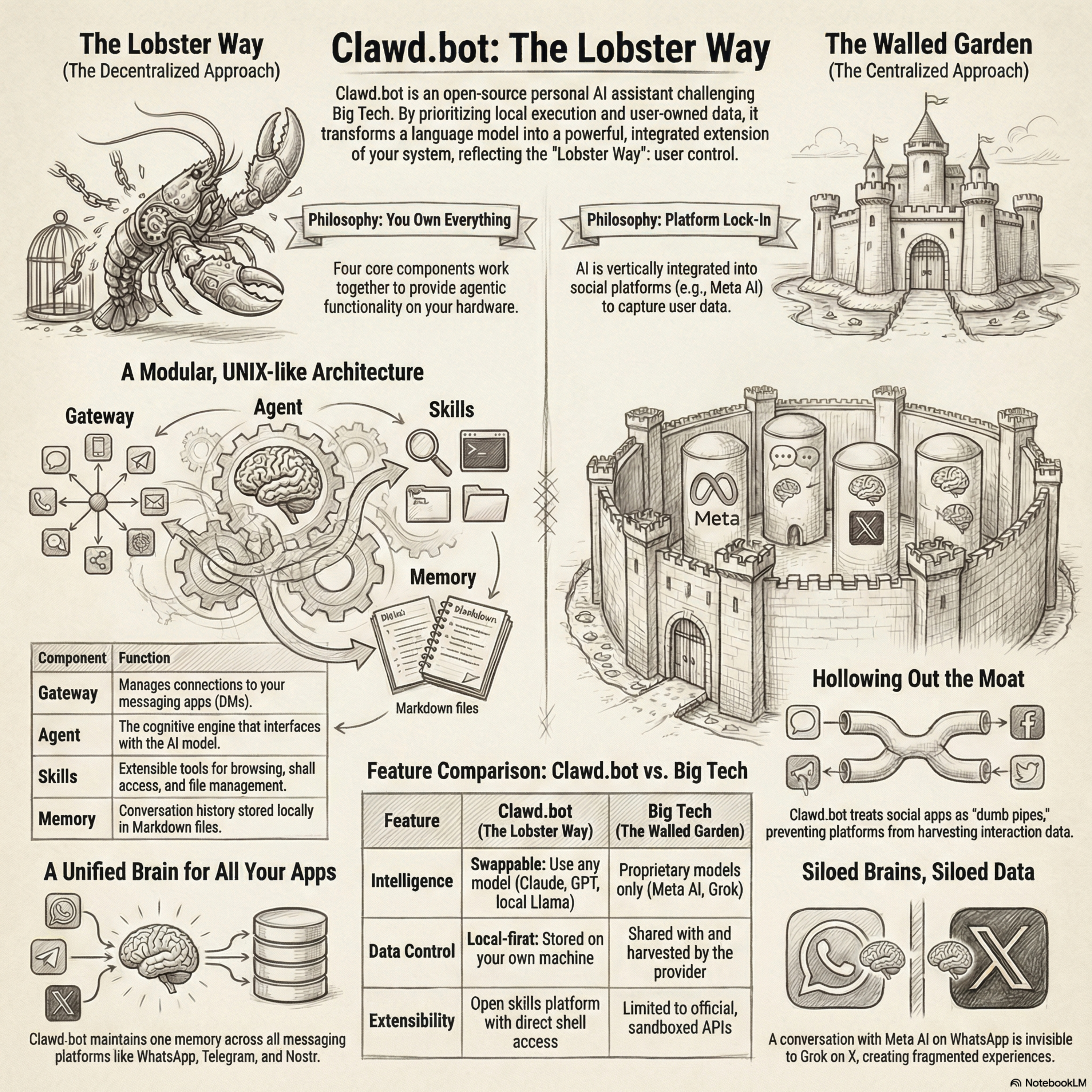 Clawd.bot represents a paradigm shift toward technical sovereignty, offering an open-source, local-first AI assistant that functions as a modular alternative to the restrictive ecosystems of Big Tech. By utilizing a "Bring Your Own Key" (BYOK) model, the platform allows users to decouple intelligence from the interface, enabling them to run powerful language models across diverse messaging channels like WhatsApp and Signal while maintaining absolute data privacy. The text highlights how this architecture undermines traditional corporate "walled gardens" through a robust skills platform that grants the AI direct agency over a user’s local files and system commands. Ultimately, the source advocates for a decentralized human-AI interface that prioritizes individual empowerment and cross-platform persistence over the data-harvesting practices of centralized social networks.#ClawdBot #TheLobsterWay #LocalFirst #TechnicalSovereignty #OpenSourceAI #PersonalOS #AgenticAI #DecentralizedAI #NoWalledGardens #UserOwned #NodeJS #TypeScript #WSL2 #SelfHosted #Docker #DevTools #WindowsSubsystemForLinux #ComputerUse #HeadlessChrome #Automation #LinuxOnWindows#DataSovereignty #Nostr #NIP04 #EndToEndEncryption #CensorshipResistance #PrivacyFirst #DumbPipes #Trustless #SmartClient #OwnYourKeys#CrossPlatform #WhatsAppBot #TelegramBot #BlueBubbles #iMessage #SignalCLI #DiscordBot #MessagingBridge #UnifiedMemory #APIIntegration#BYOK #BringYourOwnKey #LLMCosts #TokenPricing #GPT5 #ClaudeOpus #GeminiFlash #CheapAI #SubscriptionRecycling #APIEconomy#BreakingMoats #HollowOutTheMoat #BigTechVsLocal #PlatformAgnostic #HorizontalAI #DigitalAgency #ProductivityHacks #FutureOfWork