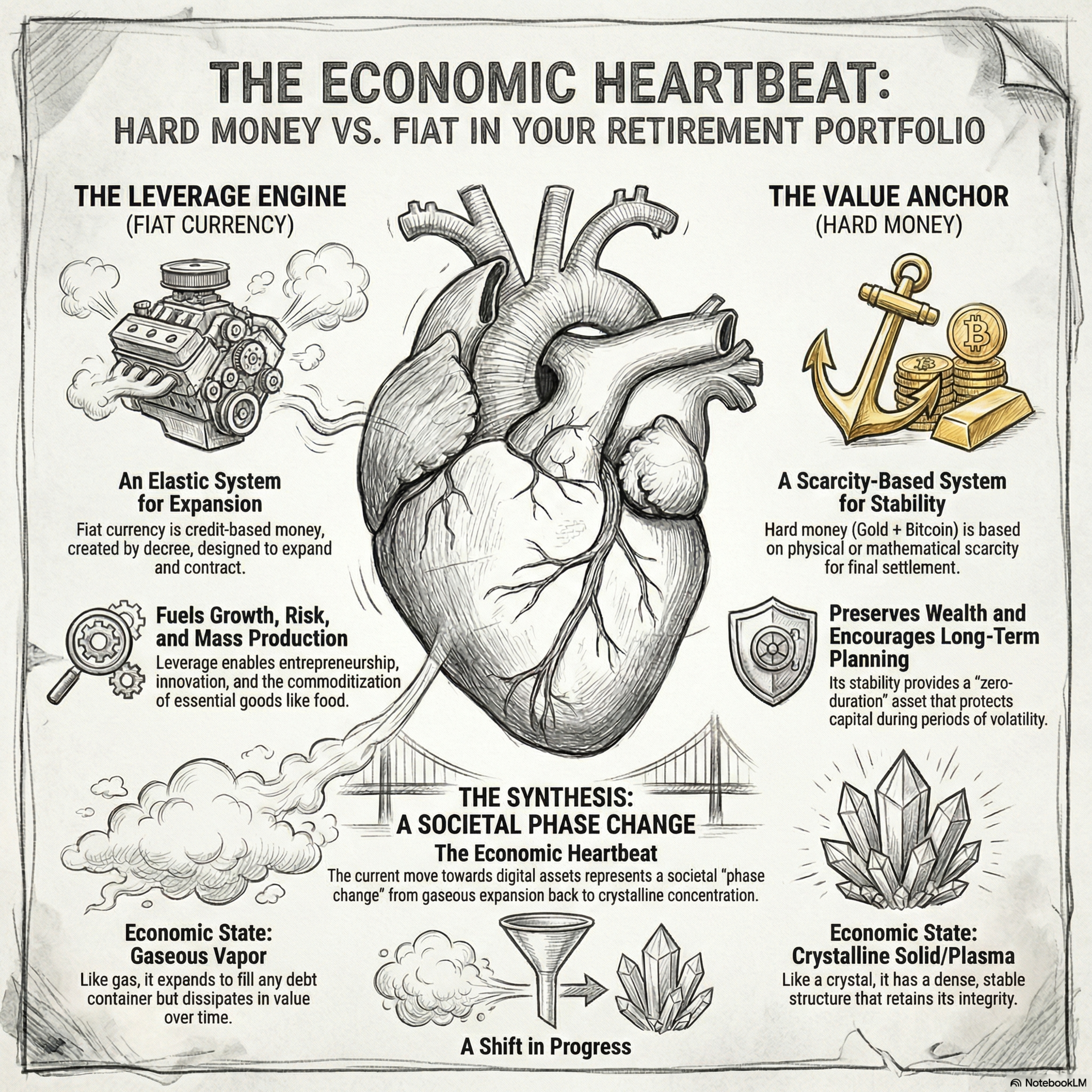 Source Text ChartsBitcoin course #Gold #bitcoin #fiatThis episode explores the dual nature of the global economy through a framework of Value and Leverage, portraying them as the rhythmic heartbeat of human civilization. The author defines Value as a centripetal force of stability and terminal settlement anchored by the scarcity of gold and Bitcoin, while Leverage acts as an expansionary engine that drives innovation, risk-taking, and mass production through elastic credit. By applying thermodynamic metaphors, the source describes the historical transition from the "solid" integrity of gold to the "gaseous" dilution of fiat currency, eventually culminating in a phase change toward the "plasma-like" efficiency of digital scarcity. Ultimately, the work suggests that society is currently pivoting back toward a Value-based paradigm, where the concentration of capital in the hands of industrious allocators and the "crystalline" order of mathematical scarcity provide a necessary counterbalance to previous eras of inflationary expansion. #ValueVsLeverage – Referring to the two distinct structures governing the modern global economic landscape.#TheEconomicHeartbeat – Describing the competition between Value and Leverage as the essential rhythm of a functioning civilization.#NewWorldOrder – From the title of the deep dive, indicating the shifting global economic framework.#GoldPlusBitcoin – Representing the "Equation of Value" which synthesizes physical and digital scarcity into a unified anchor.#TerminalSettlement – Highlighting the role of Value assets in facilitating final asset transfers rather than IOUs.#AbsoluteScarcity – Referring to Bitcoin’s mathematical limit of 21 million units and Gold’s high stock-to-flow ratio.#ZeroDuration – Describing assets like Gold that carry no counterparty risk.#LowTimePreference – The societal incentive to plan intergenerationally in a Value-based system.#FiatTimesDebt – Representing the "Equation of Leverage" where currency derives value from decree and functions as a multiplier.#EconomicExpansion – Acknowledging leverage as the "breath" of the economic universe necessary for risk-taking and innovation.#NixonShock – The 1971 event that unhinged the dollar from gold, acting as a catalyst for global commoditization.#Commoditization – The mass production enabled by leverage and automation.#CantillonEffect – The mechanism of "functional bifurcation" where early receivers of new money benefit before prices rise.#IndustriousAllocators – The class of high-performing individuals (like Elon Musk) who concentrate capital to drive global growth,.#FunctionalBifurcation – The splitting of society into economic tiers to direct resources toward "higher-order" missions,.#MonetaryThermodynamics – The analogy comparing Gold to solids, Fiat to gas/vapor, and Bitcoin to plasma.#SocietalPhaseChange – The concept that a change in the store of value mirrors a change in societal orientation.#DigitalCredit – Emerging as "Anti-Leverage" in the Bitcoin paradigm, acting as a centripetal force rather than a centrifugal one.#Crystallization – The shift from the "gaseous expansion" of fiat back to the ordered density of a scarcity-based system.