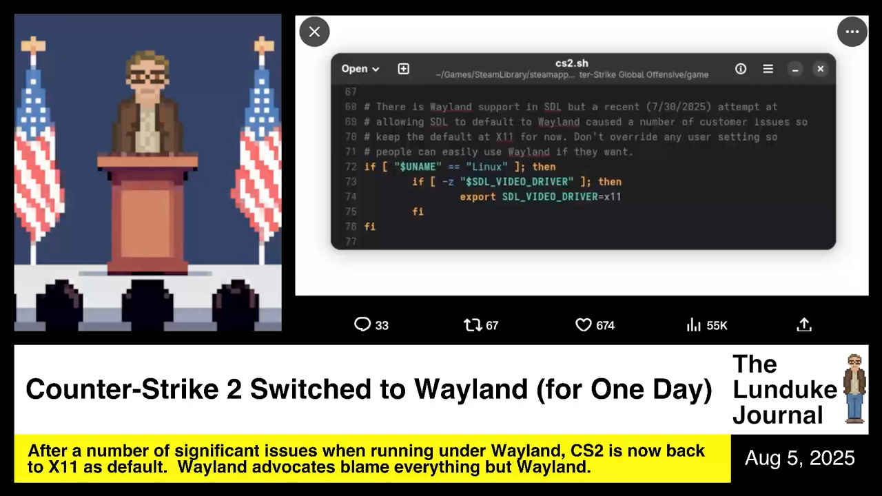 After a number of significant issues when running under Wayland, Valve's CS2 is now back to X11 as default. Wayland advocates blame everything but Wayland.More from The Lunduke Journal: https://lunduke.com/ This is a public episode. If you'd like to discuss this with other subscribers or get access to bonus episodes, visit lunduke.substack.com/subscribe